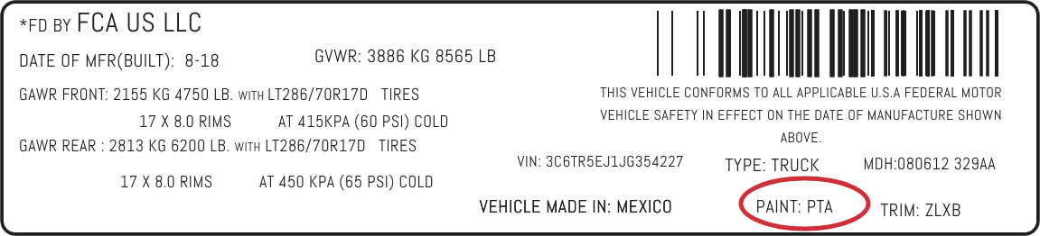 As shown in the image, your Chrysler paint code is usually located at the bottom left-hand corner of the sticker or metal plate, and will consist of 3 characters beginning with “P”. If in doubt about where your paint code is, it’s always best to check using our registration colour code finder tool.